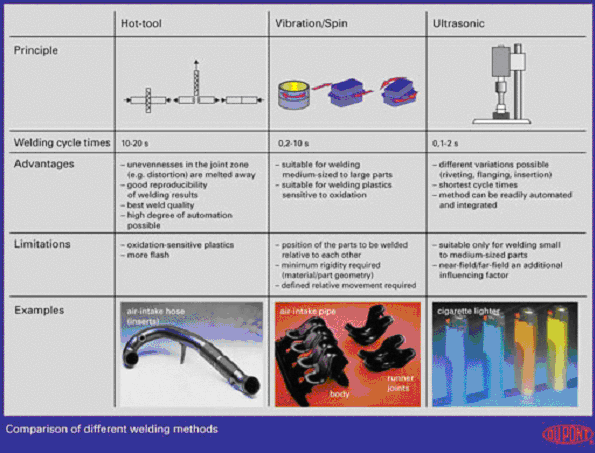 大規(guī)模生產(chǎn)中,有許多不同的廉價(jià)的焊接方法。最常用的塑料工程零件的焊接方法有(圖1):