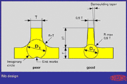 對(duì)于表面要求非常高的組件,如汽車(chē)輪蓋,的尺寸是非常重要的。正確的設(shè)計(jì)可以減少組件形成表面凹痕的可能,以提高組件的質(zhì)量。的底部的材料積聚在圖1所示的圓中。這個(gè)圓的大小與的尺寸相關(guān),應(yīng)該越小越好,這樣才能減小或避免凹痕。如果圓太大,可能會(huì)形成內(nèi)部空洞,制品的機(jī)械性能將會(huì)非常差。