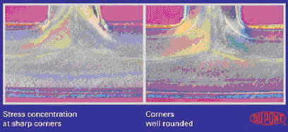 如果給一個(gè)有的組件以負(fù)載,則的底部可能會(huì)產(chǎn)生應(yīng)力。在這一部位如果沒(méi)有圓弧,可能會(huì)產(chǎn)生非常高的應(yīng)力集中(見(jiàn)圖3),通常會(huì)導(dǎo)致組件的斷裂和報(bào)廢。補(bǔ)救措施是建立一個(gè)半徑足夠大的圓弧(圖1),使肋底部建立更好的應(yīng)力分布。