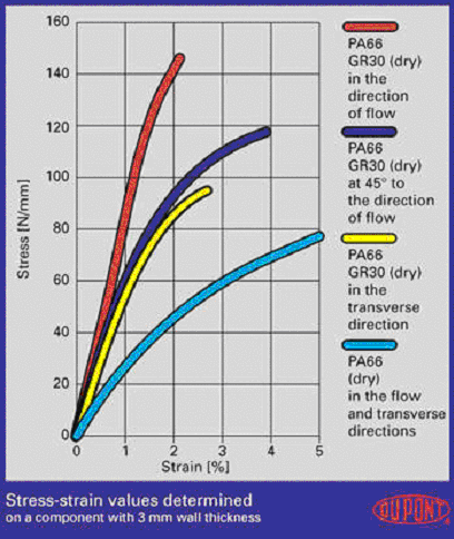 在注射成型過程中,長鏈的塑料分子、纖維填料和增強材料的取向主要由熔融塑料的流動方向決定,這導致了部件性能對方向的相關性(各向異性)。例如,流動方向上的伸展性能比垂直方向上的伸展性能要好得多(見圖1)。含有纖維增強材料的部件所受到的影響比不含纖維增強材料的部件要大得多。纖維的取向也引起部件在水平和垂直方向上的收縮差異,這將異致部件發生翹曲。