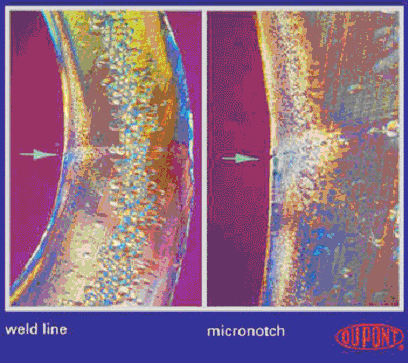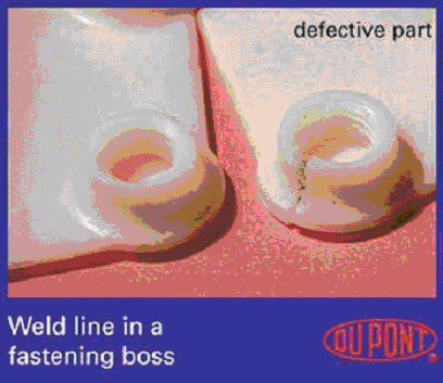 當模具中2條或更多的熔流會聚到一起時,就會產生熔合線。例如,在熔體需要流經嵌件,或制品同時在幾點進行澆注時,就會出現熔合線(見圖2a和2b)。而且,同一制品中不同的壁厚可能導致熔體前方分離,從而產生熔合線。當應從模具中排除的空氣被熔體封閉在模具中無法溢出時,就會產生空氣存集(出現氣泡)。熔合線和空氣存集通常被作為表面缺陷的表現。除了會使表面難看外,它們還會明顯降低受影響區域的機械性能,特別是沖擊強度(見圖3和圖4)。