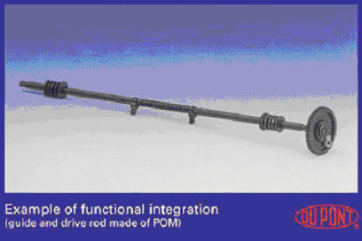 圖3中,牽引棒、彈簧、鋸齒、卡扣和軸承都為一次注射成型。而同樣的金屬設計則需要不少于5個獨立元件來組裝,并且當軸桿與活塞連接時,還需要潤滑。實際上,在這一環節使用聚甲醛樹脂便可以不用另加潤滑劑。