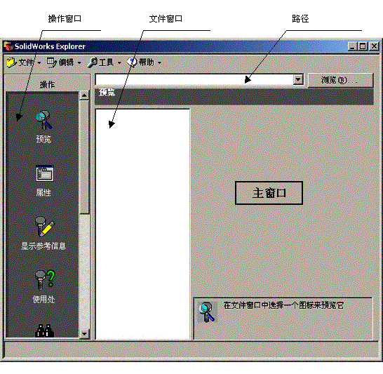 此窗口中顯示圖標,這些圖標代表可以用SolidWorks Explorer(瀏覽器)執行的文件管理任務。