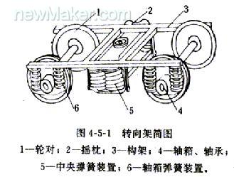 鐵路車輛大致可以分為車體、轉向架、連接緩沖裝置等部分。轉向架是鐵路車輛的走行部分,它的作用是承受車體上部的重量,傳遞牽引力和制動力,緩和線路對車輛的沖擊。轉向架一般包括輪對軸箱裝置、彈性懸掛裝置、構架和側架、基礎制動裝置、車體支承裝置等部分(如圖1)。目前,我國鐵路貨車的主型轉向架是轉8A型轉向架,包括:軸承、輪對、側架、鍥塊、搖枕、枕簧、滑槽式基礎制動裝置、旁承及下心盤等主要零部件組成。