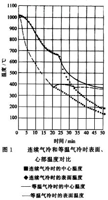 形狀復雜的較大工件從高溫連續進行快速冷卻時容易產生變形甚至裂紋。以往可用鹽浴等溫淬火解決。在單室真空高壓氣冷淬火爐中能否進行氣冷等溫淬火呢?圖1為在帶有對流加熱功能的單室高壓氣冷淬火爐中對兩組φ320mm×120mm兩塊疊裝的碳素結構鋼用不同冷卻方式淬火后的對化結果。圖中一組曲線是在102O℃加熱后,在6×105Pa壓力下連續用高純氮氣冷卻(風向是上、下相互交替,40s切換一次)的結果。另一組是對試樣表面、心部進行370℃時的控制冷卻。從兩組曲線的對比可以看出,心部溫度通過50O℃的時間(半冷時間)只差約2min。從表面進行控制冷卻開始到心部溫度到達370℃附近,需27min。由此可見,在單室真空高壓氣淬火爐進行等溫氣冷淬火是可行的。